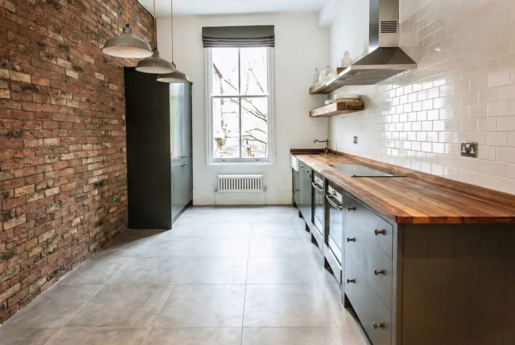 Керамическая плитка и керамогранит — один из самых устойчивых вариантов для кухни. Материал спокойно переносит влагу, перепады температуры, брызги жира и регулярную уборку. Поэтому его используют не только для фартука, но и для отделки всей стены.