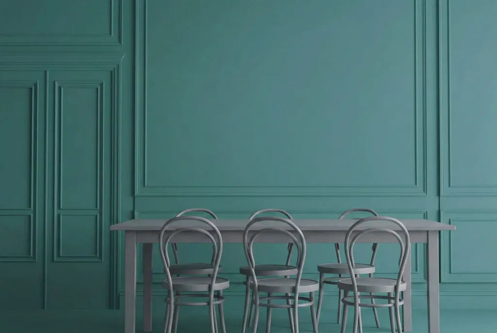 Цвет доминанты поддерживают деталями: текстилем на стульях, светильником, декором. Поддержка должна быть дозированной, без перегруза.