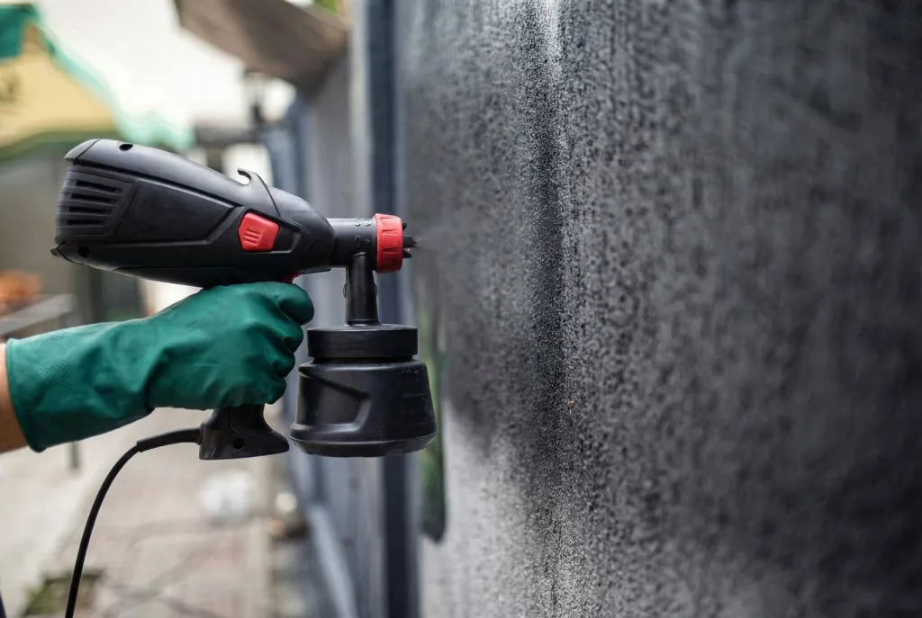 Краскопульт используют, когда нужно быстро покрыть большую площадь одним цветом. Он наносит краску тонкими слоями и хорошо прокрашивает рельефные покрытия вроде «барашка». Расход обычно получается ниже, чем при работе кистью.