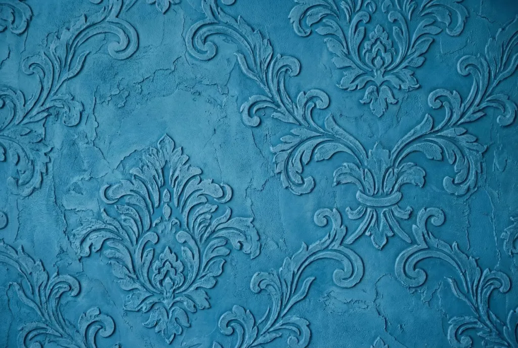 Этот способ подходит для гладкой декоративной штукатурки, когда хочется добавить рисунок без сложных эффектов. Сначала стену окрашивают в базовый цвет и дают покрытию полностью высохнуть. После этого узор наносят вторым оттенком — через трафарет или фигурным валиком.