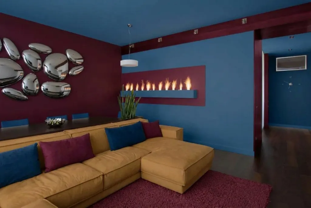 С ним можно собрать выразительную прохладную палитру: сочетать разные вариации синего с белым, светло-серым, чёрным, а также добавлять фиолетовые акценты. Такой подход подходит для кухни и ванной, а также для комнат на южной стороне. Усилить эффект помогают каменные фактуры, стекло и металл.