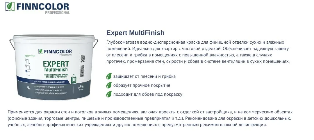 Рады представить новинку на рынке отделочных материалов — краску Finncolor Expert MultiFinish. Эта водно-дисперсионная краска идеально подходит для финишной отделки стен и потолков как в сухих, так и во влажных помещениях.