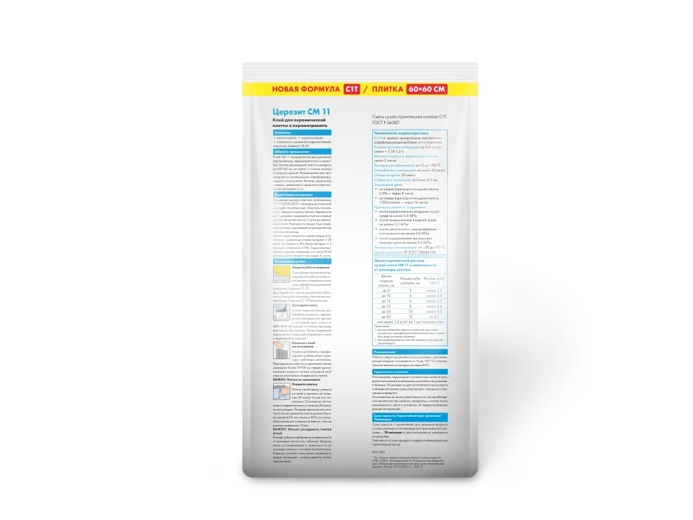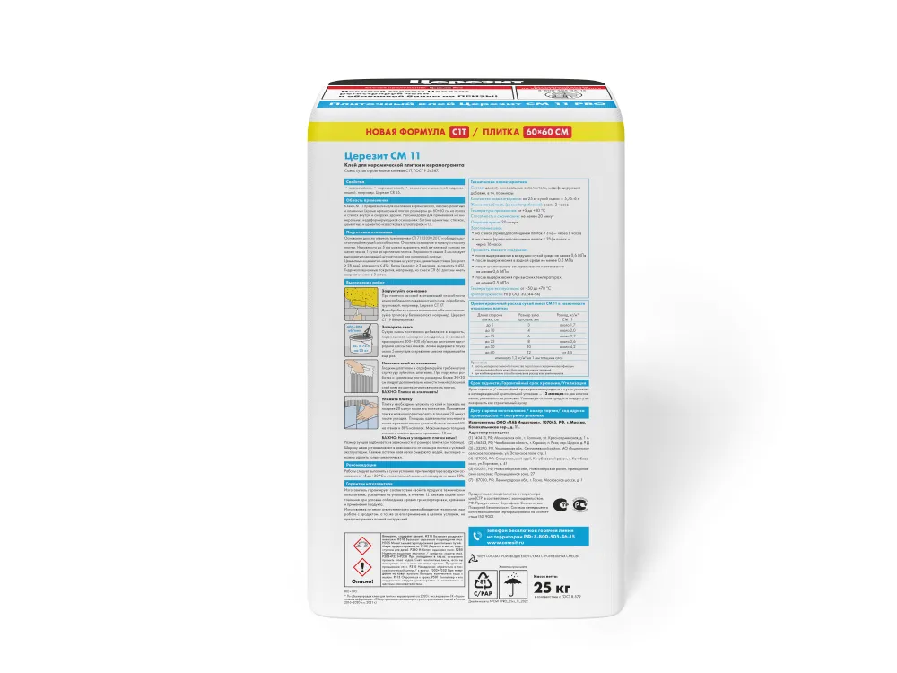 Церезит CM 11 PRO - смесь сухая строительная клеевая для керамической плитки для пола и стен C0 T, ГОСТ Р 56387-2018.