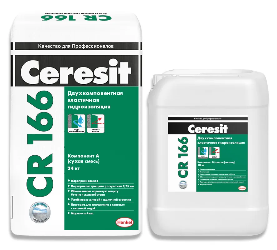 Гидроизоляционная масса CR 166 поставляется в комплекте из 2-х упаковок общим весом по 34 кг: