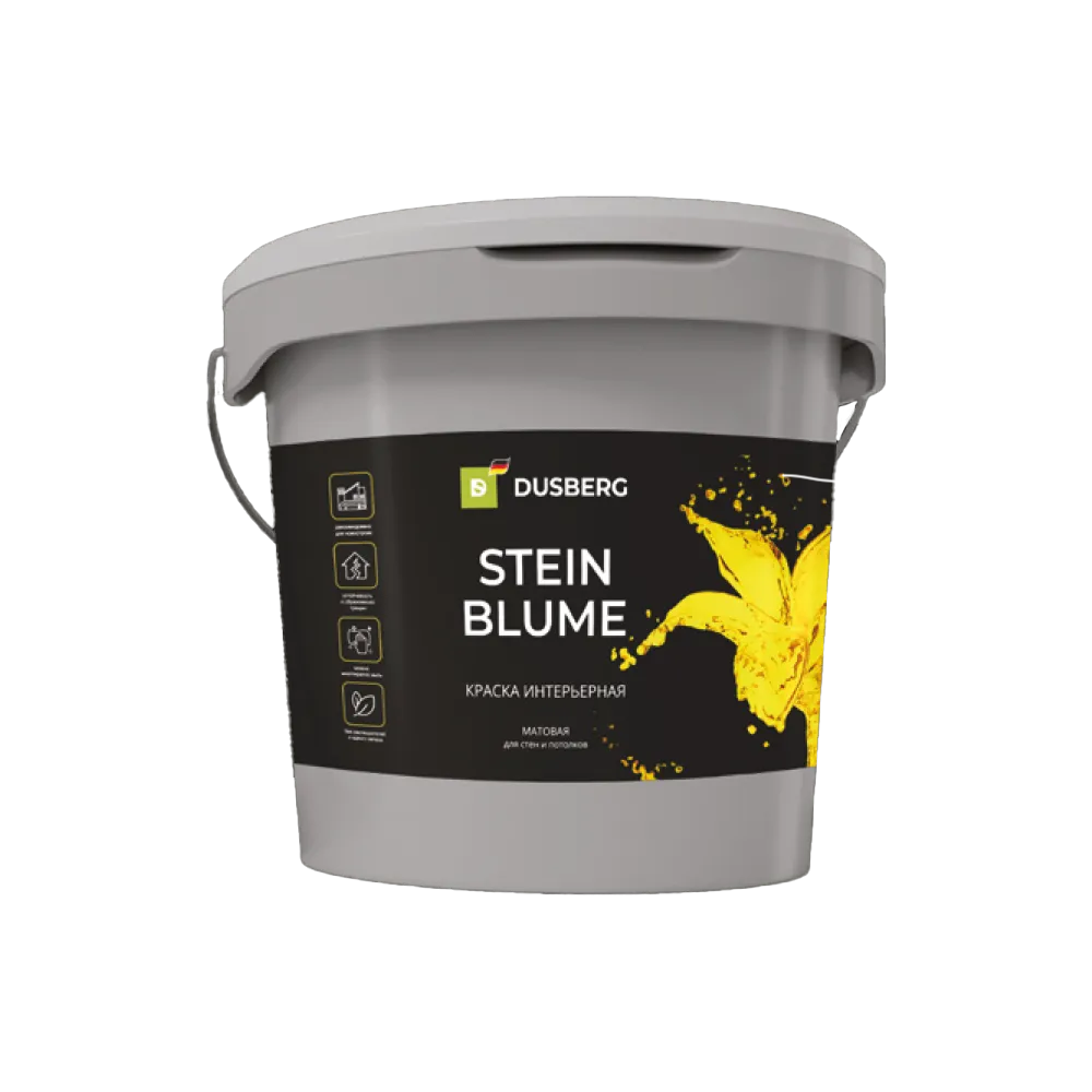 DUSBERG Steinblume Интерьерная краска для стен и потолков – это матовая акриловая эластичная краска для внутренних работ. Обладает высокой эластичностью и устойчивостью к образованию трещин даже при низких температурах, поэтому отлично подходит для окраски поверхностей в новых зданиях, не прошедших усадку.