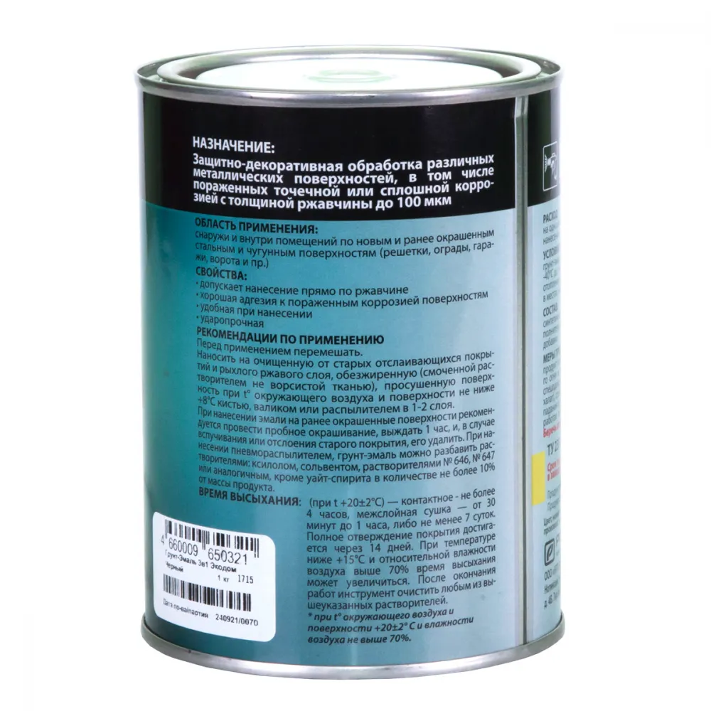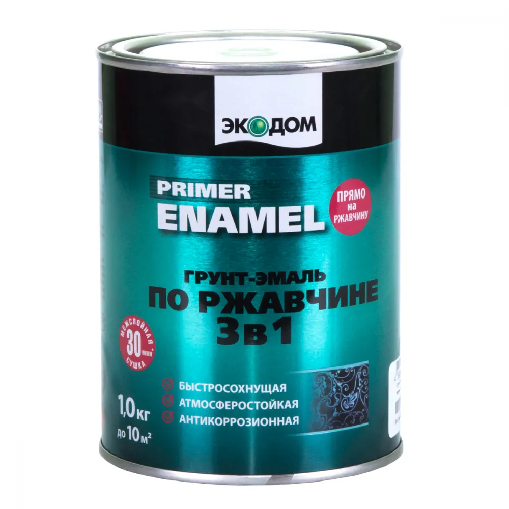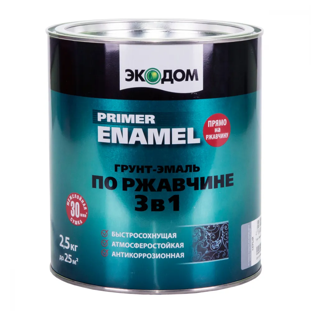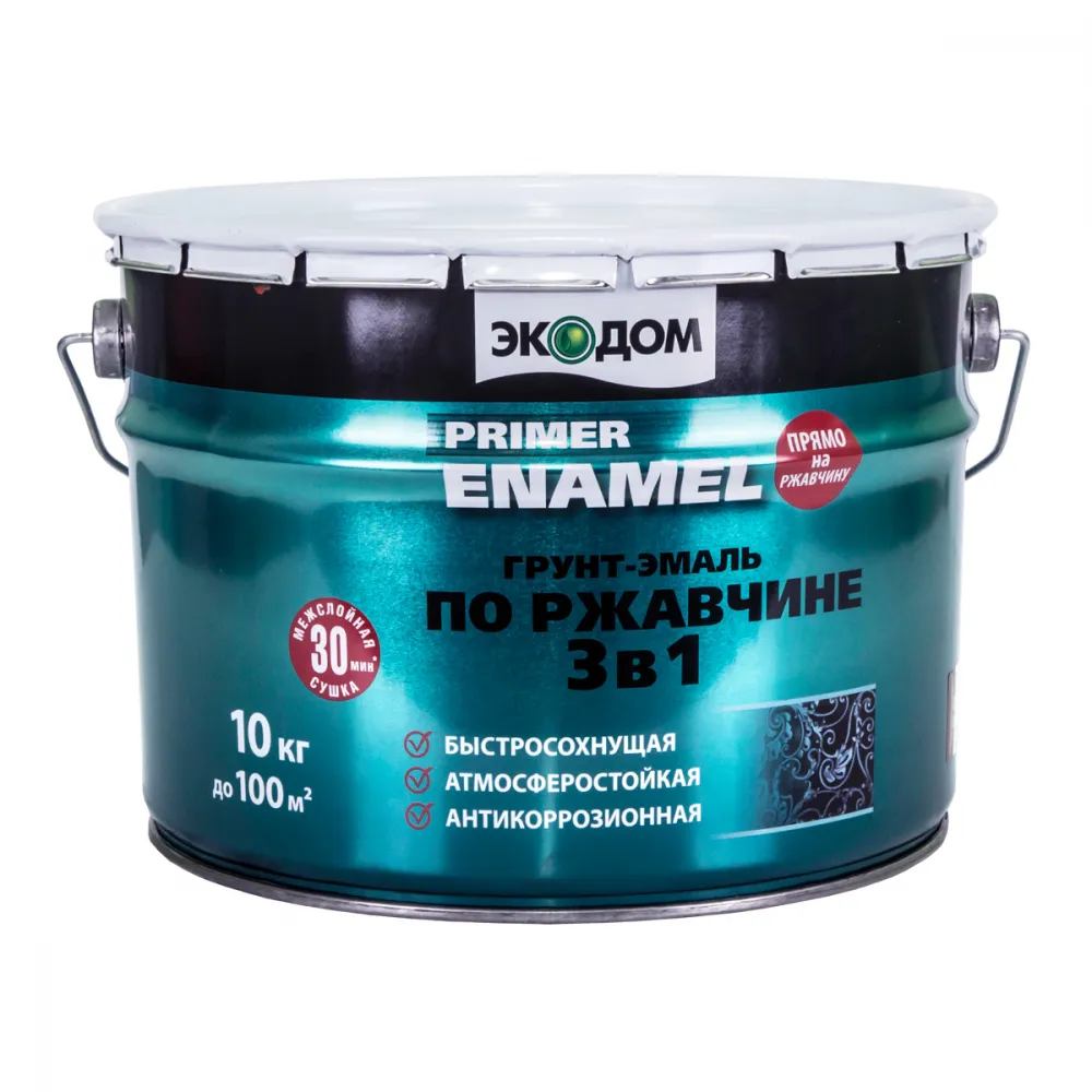 Экодом Грунт-эмаль по ржавчине 3 в 1 гладкая полуматовая для обработки различных металлических поверхностей, в том числе пораженных точечной или сплошной коррозией, снаружи и внутри помещений по новым и ранее окрашенным стальным и чугунным поверхностям.