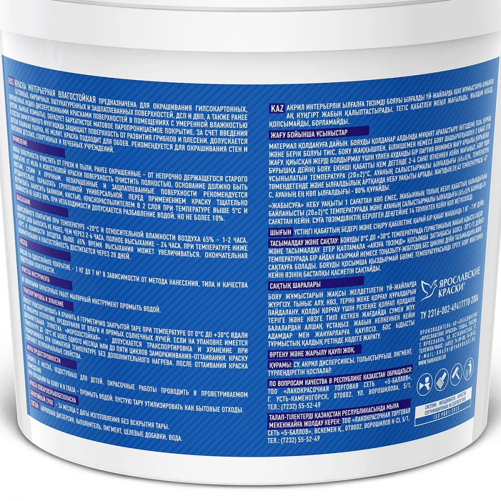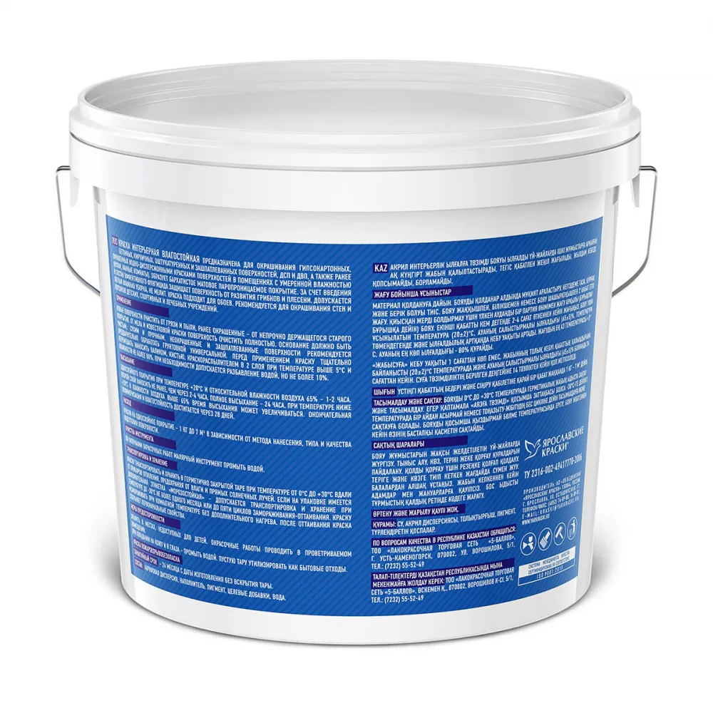 Интерьерная влагостойкая краска для внутренних работ в умеренно влажных помещениях образует белое матовое покрытие, легко наносится ровным слоем, быстро высыхает, не отслаивается, не мелит. Для окрашивания гипсокартонных, бетонных, кирпичных, оштукатуренных и зашпатлеванных поверхностей, ДСП, ДВП, а также для ремонтной окраски прочно держащихся водно-дисперсионных покрытий.