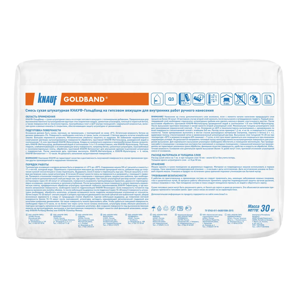 Смесь КНАУФ-Гольдбанд фасуется в бумажные мешки по 30 кг. Мешки хранить в сухом помещении на деревянных поддонах, плотно накрыв полиэтиленовой пленкой для сохранения рабочих свойств смеси. Материал из поврежденных мешков использовать в первую очередь. После вскрытия упаковки сухую смесь рекомендуется использовать полностью. Срок хранения в неповрежденной упаковке – 6 месяцев с даты изготовления. Дата изготовления указана на боковой стороне мешка. Упаковка и продукт по истечении срока хранения подлежат утилизации как бытовой мусор.