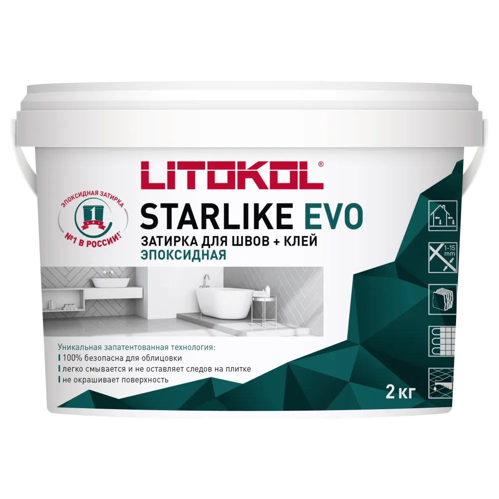 Двухкомпонентный эпоксидный кислотостойкий, щелочестойкий состав для затирки межплиточных швов с шириной шва от 1 до 15 мм и использования в качестве клея для всех видов облицовочной плитки и мозаики. STARLIKE EVO - единственная в мире запатентованная эпоксидная затирка. При нанесении не даёт эффекта прокрашивания на керамической плитке, мозаике, плитке из натурального камня.