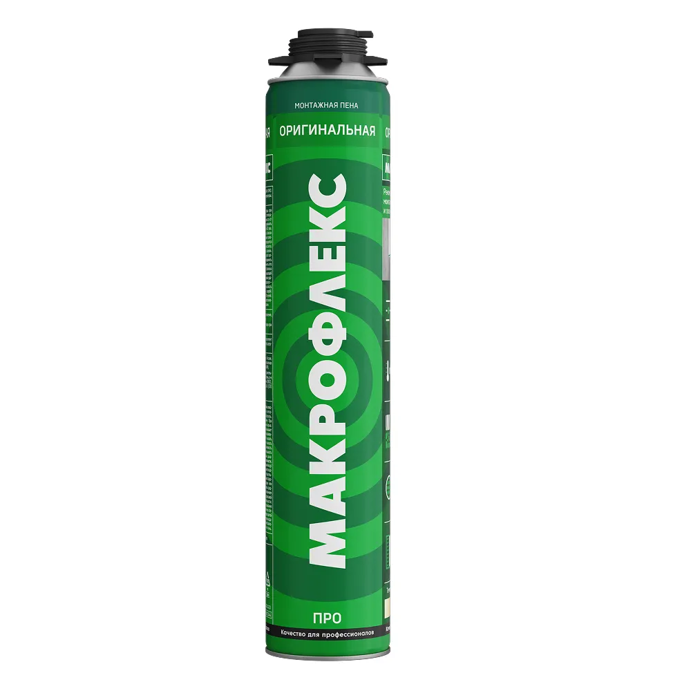Макрофлекс Оригинальная ПРО - высококачественная однокомпонентная, отверждаемая за счёт реакции с влагой воздуха, полужёсткая полиуретановая пена с превосходным соотношением открытых-закрытых ячеек и высокой механической прочностью. Продукт прост в употреблении, наносится при помощи специального монтажного пистолета.