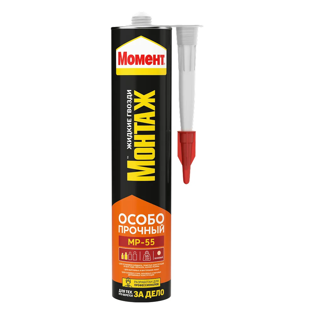 Момент Монтаж Особопрочный МР-55 для быстрого и надежного крепления тяжелых конструкций, требующих высокой прочности и долговечности. Незаменим при установке наружной обшивки, сайдинга, кровли, черновых полов, каменной облицовки, стеллажей, столешниц и т.д. Склеивание можно производить при температуре от -12°C до +45°C.