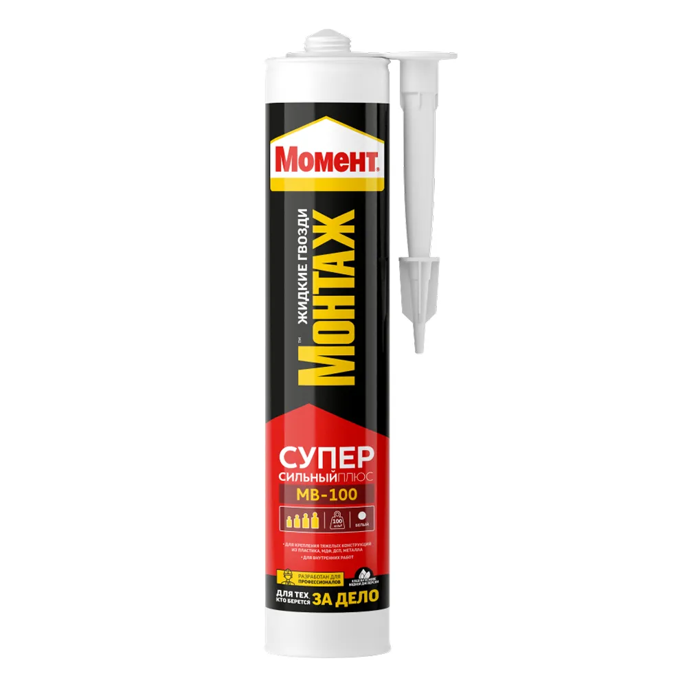 Универсальный клей на основе водной дисперсии полиакрилатов. Момент Монтаж Суперсильный МВ-100 белый обладает высокой начальной силой склеивания (100 кг/м2) и отлично подходит для различных ремонтных работ.