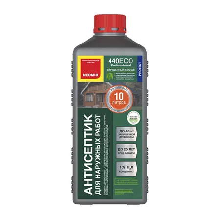 NEOMID 440 ECO — бесцветное средство для наружных и внутренних работ, в том числе для помещений с повышенной влажностью. Предназначено для защиты древесины различных пород от гниения, поражения дереворазрушающими и деревоокрашивающими плесневыми грибами, насекомыми-древоточцами, водорослями, мхами, лишайниками на срок до 25 лет (если закрыт пленкообразующим составом, например, лессирующим средством NEOMID BiOCOLOR).