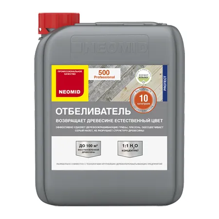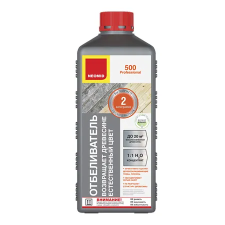 NEOMID 500 — отбеливающий и очищающий состав. Эффективно уничтожает деревоокрашивающие и дереворазрушающие грибы, удаляет серый налет, возвращает древесине естественный цвет, повышает ее сортность. Может быть использован для обработки паллет для хранения и транспортировки пищевых продуктов. Не изменяет структуру древесины, ее естественных свойств.