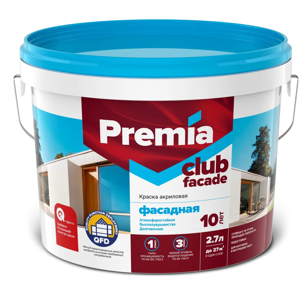 Экологичная акриловая фасадная краска PREMIA CLUB предназначена для окраски фасадов зданий, открытых помещений под навесом (балкон, лоджия, веранда), а так же для работ внутри жилых, общественных, производственных помещений с постоянным и временным пребываем людей, зданий типа А, Б, В.