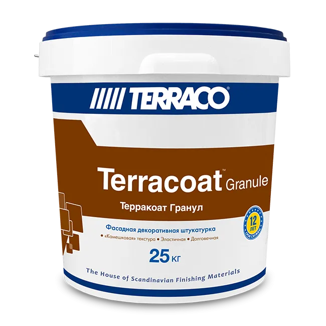 Терракоат Гранул - это готовое к применению финишное декоративное штукатурное покрытие на акриловой основе с выраженной наполненной зернистой текстурой типа «шуба». Материал обеспечивает сочетание качественной архитектурной отделки с экономичностью, легкостью нанесения и долговечностью.