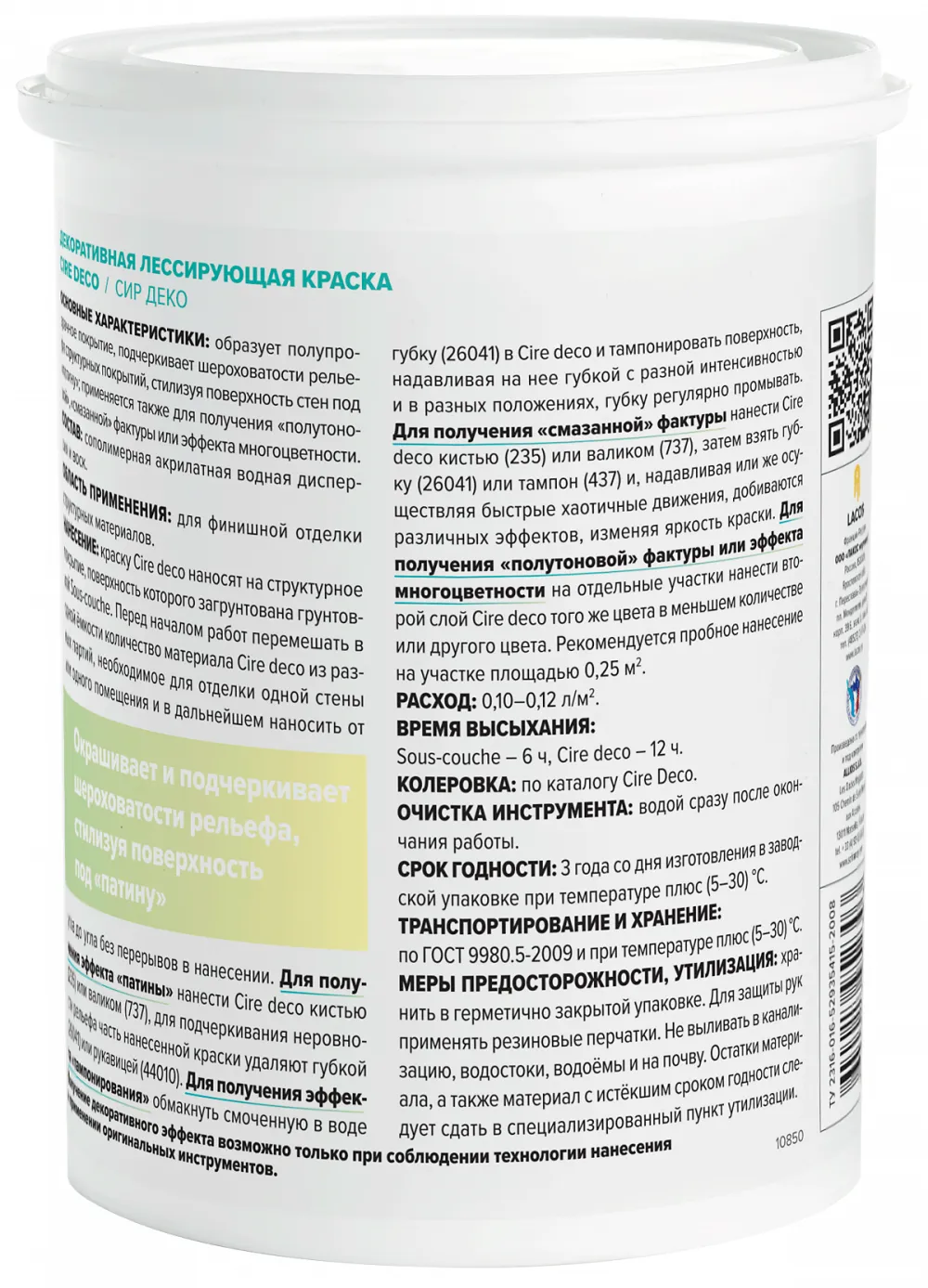 - Cire Deco — лессирующая краска, содержащая воск. Нанесение Грунтовка Sous-couche наносится в один слой валиком (737) или кистью (235) тонким слоем, на контрастные основания — в два слоя.