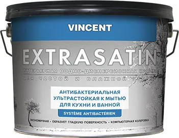 Vincent Extrasatin профессиональная легко наносимая износостойкая влагостойкая краска без запаха, подходящая для мест с повышенной сыростью, а также для аудиторий, где следует часто и многократно мыть потолок и стены.