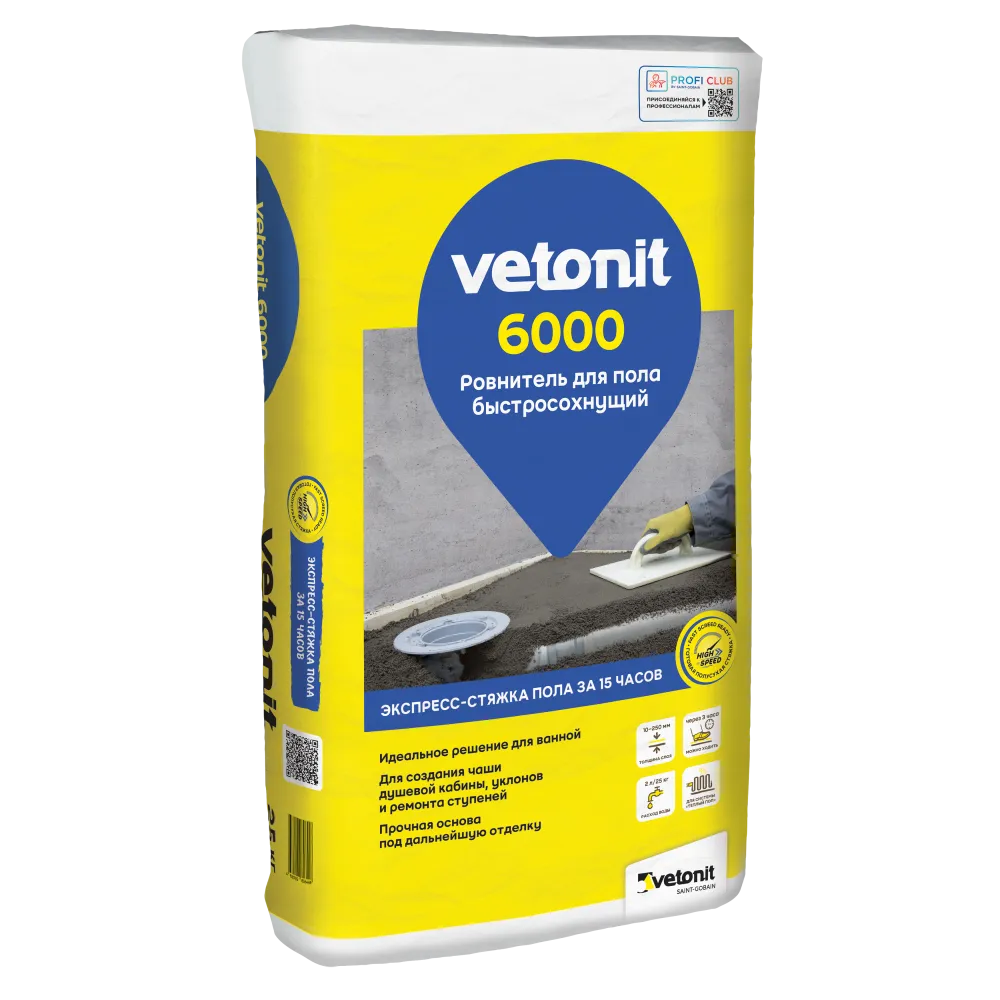Vetonit 6000 - быстросохнущий ровнитель для пола на цементной основе. Ходить по полу можно уже через 3 часа, а укладка покрытия возможна всего через 15 часов. Оптимальное решение для срочного ремонта и реализации специальных решений: создания подиумов под ванну, формирования чаши душевой кабины, ремонта ступеней, скрытия коммуникаций в полу, заделки труб и проводов.